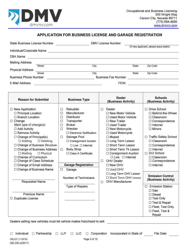 Carson City, Nevada 89711 (775)684-4690 www.dmvnv.com OBL243 (10/2016) ... (OBL253) from manufacturers or distributors, authorizing sale of designated vehicles make. 19.