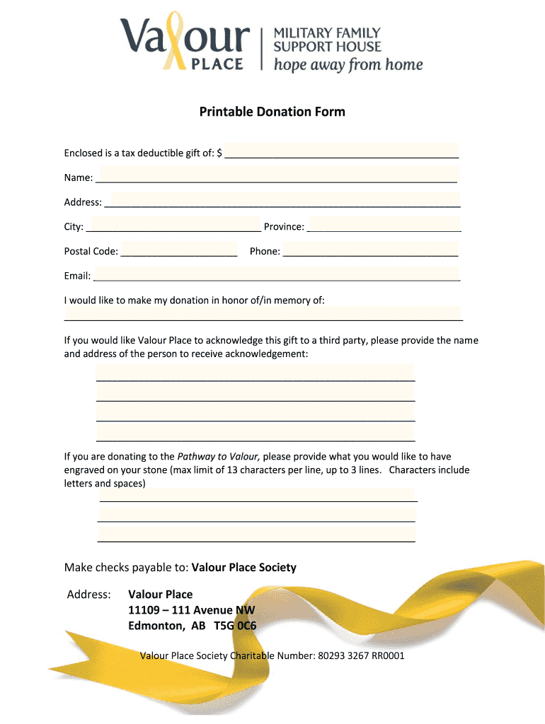 Get the free Printable Donation Form - Valour Place - valourplace