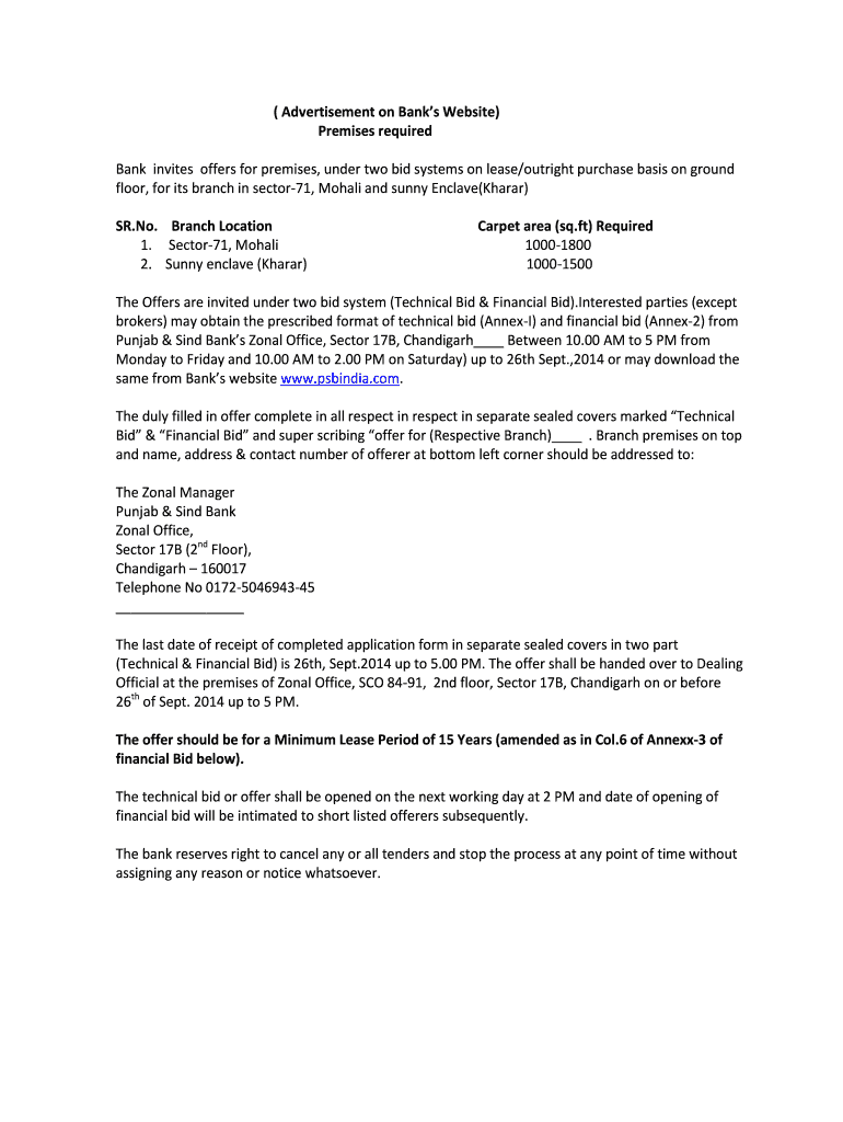(Advertisement on Banks Website) Premises required Bank invites offers for premises, under two bid systems on lease/outright purchase basis on first floor, for its branch in sector71, Moral and sunny