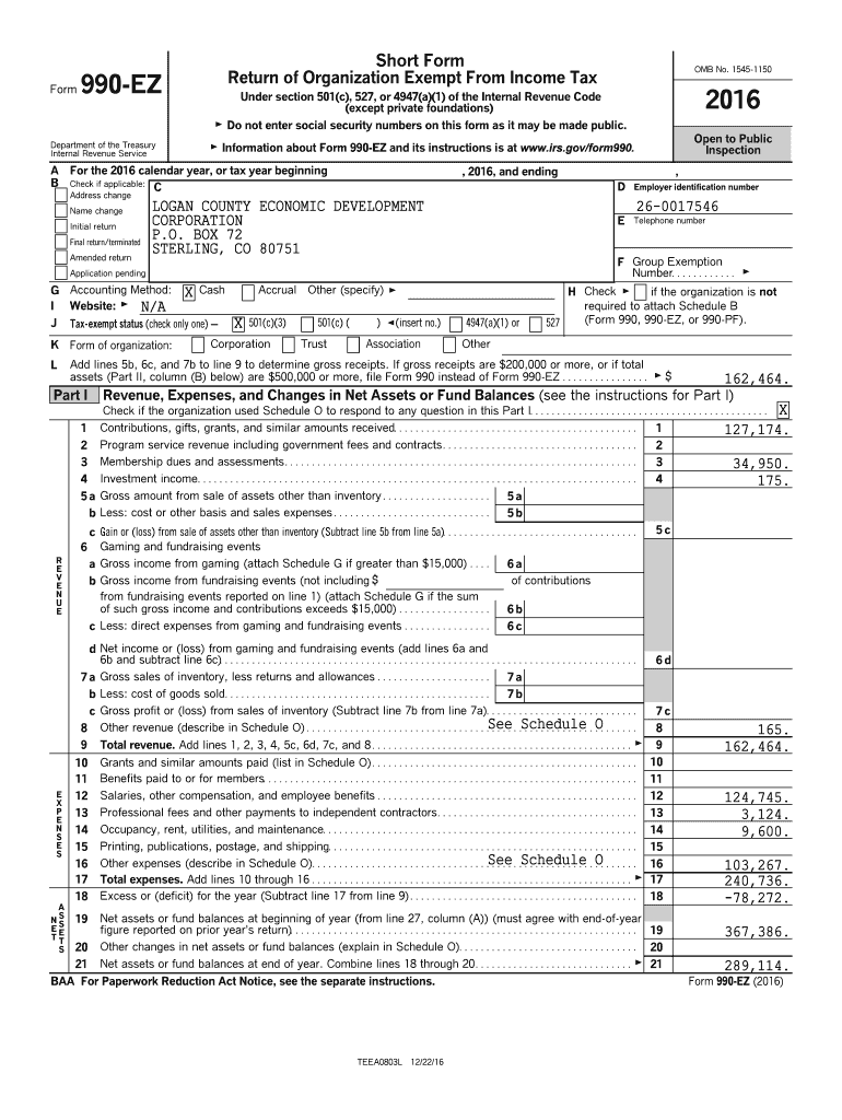 Form Short Form Return of Organization Exempt From Income Tax 990EZ OMB No. 15451150 2016 Under section 501(c), 527, or 4947(a)(1) of the Internal Revenue Code (except private foundations) G Do not