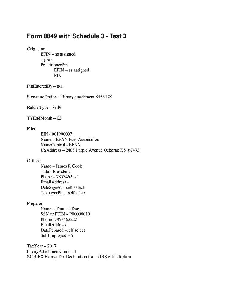 Form 8849 with Schedule 3 Test 3 Originator ERIN as assigned Type Practitioners ERIN as assigned PIN PinEnteredBy n/a SignatureOption Binary attachment 8453EX Returnable 8849 TYEndMonth 02 Filer EIN