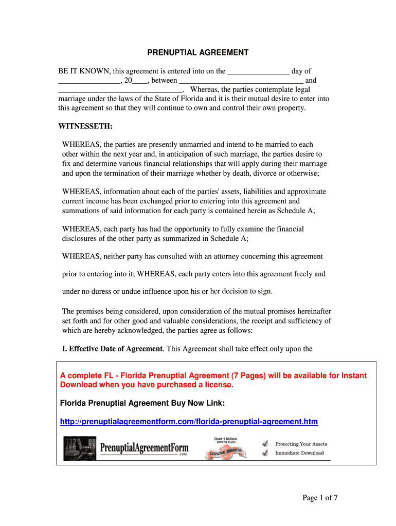 PRENUPTIAL AGREEMENT BE IT KNOWN, this agreement is entered into on the day of, 20, between and. Whereas, the parties contemplate legal marriage under the laws of the State of Florida, and it is their