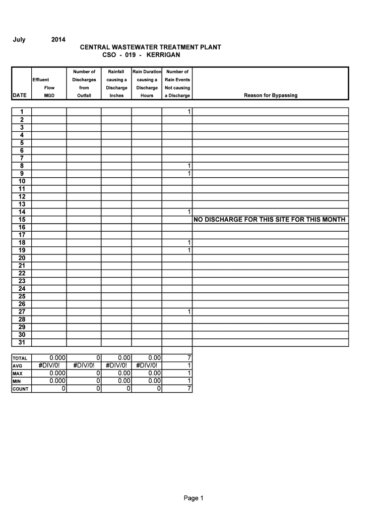 July 2014 CENTRAL WASTEWATER TREATMENT PLANT CSO 019 KERRIGAN Number of Rainfall Rain Duration Number of Discharges causing a Rain Events Flow from Discharge Not causing MGD Outfall Inches Hours a