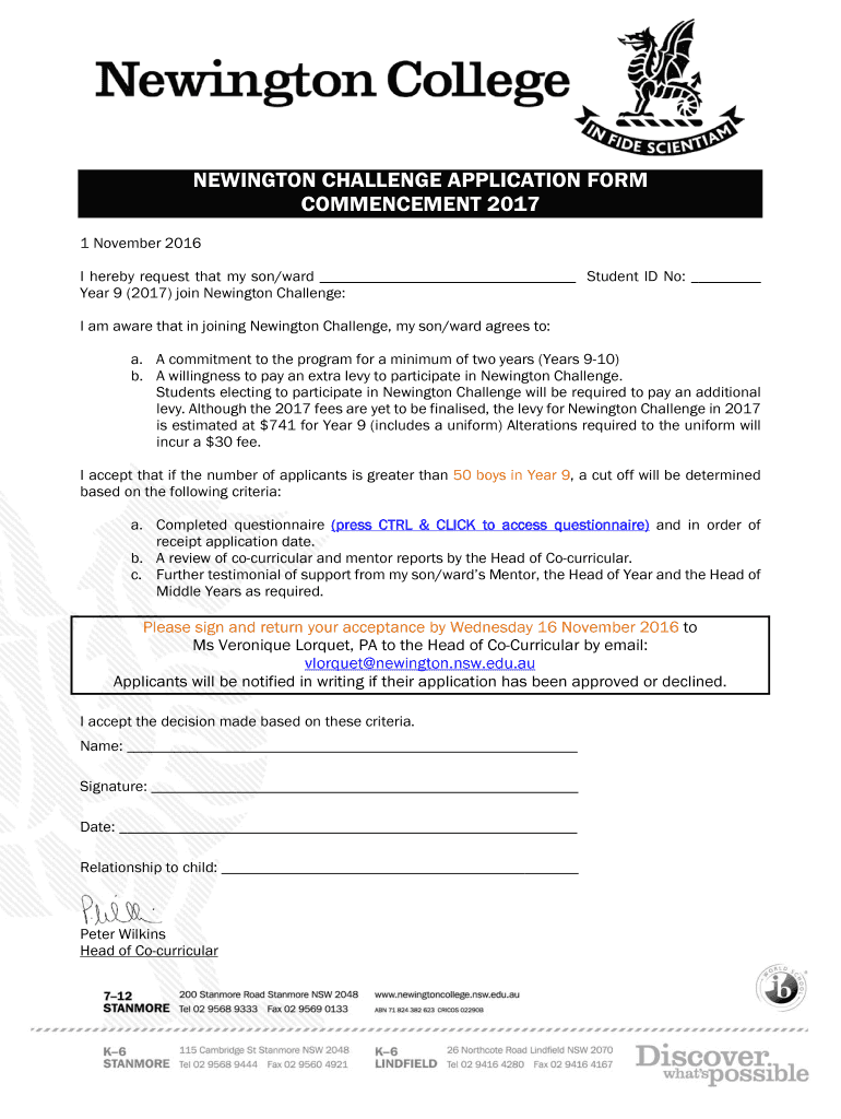NEWINGTON CHALLENGE APPLICATION FORM COMMENCEMENT 2017 1 November 2016 I hereby request that my son/ward Student ID No: Year 9 (2017) join Newington Challenge: I am aware that in joining Newington