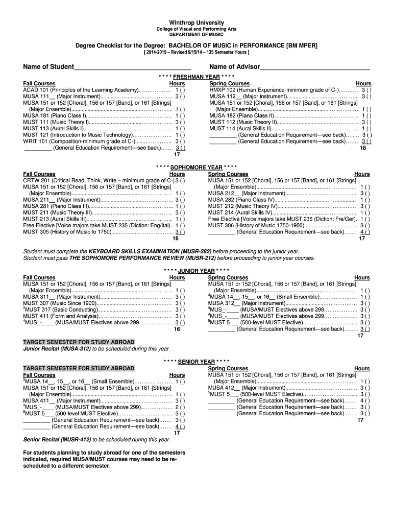 Winthrop University College of Visual and Performing Arts DEPARTMENT OF MUSIC Degree Checklist for the Degree: BACHELOR OF MUSIC in PERFORMANCE BMM PER 20142015 Revised 9/15/14 135 Semester Hours