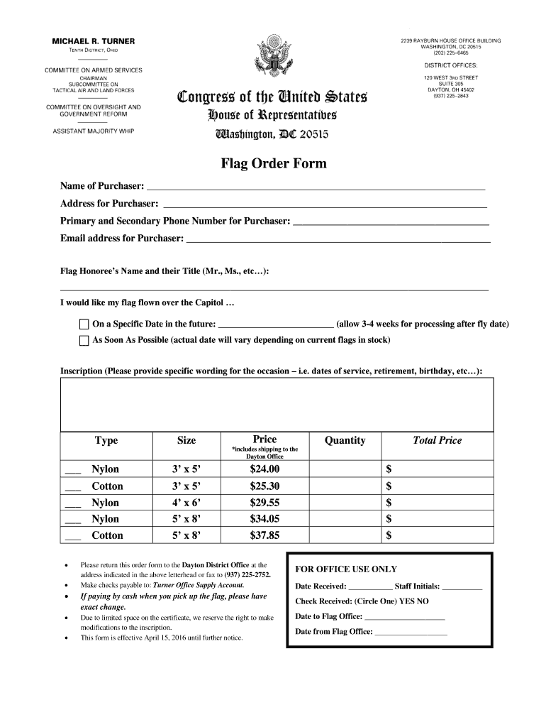 Flag Order Form Name of Purchaser: Address for Purchaser: Primary and Secondary Phone Number for Purchaser: Email address for Purchaser: Flag Honorees Name and their Title (Mr., Ms., etc): I would