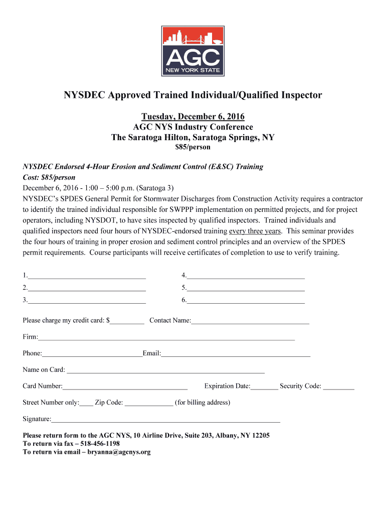 NYSE Approved Trained Individual/Qualified Inspector Tuesday, December 6, 2016, AGC NYS Industry Conference The Saratoga Hilton, Saratoga Springs, NY $85/person NYSE Endorsed 4Hour Erosion and Sediment
