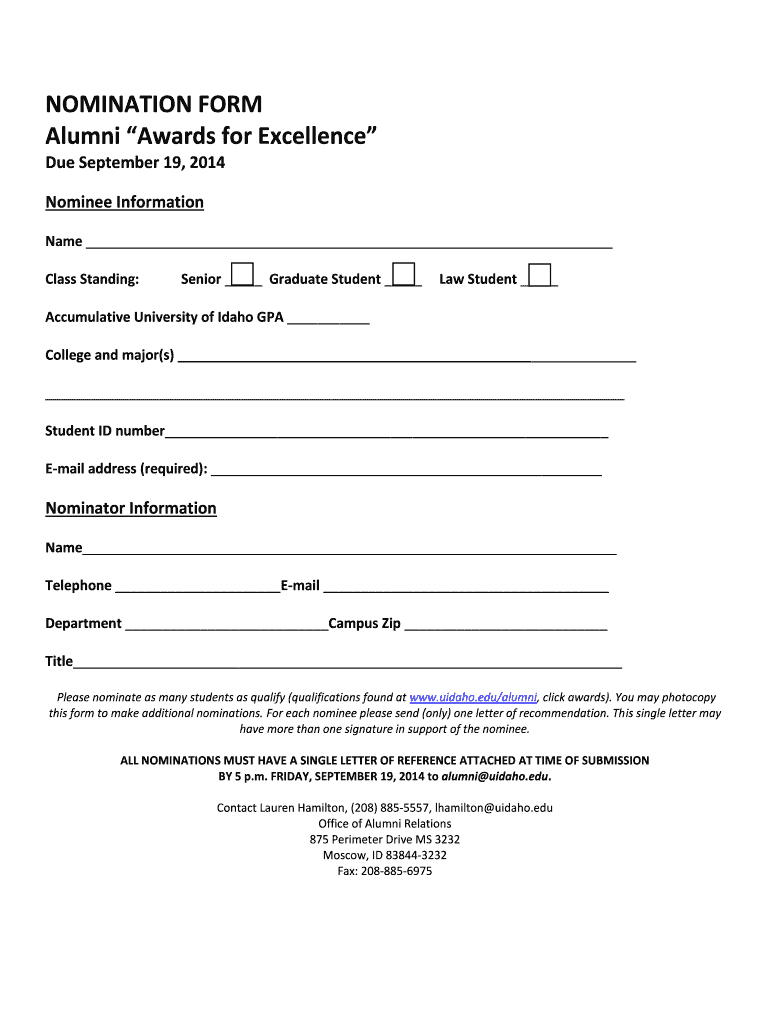 NOMINATION FORM. Alumnus Awards for Excellence. Due September 19, 2014. Nominee ... have more than one signature in support of the nominee.