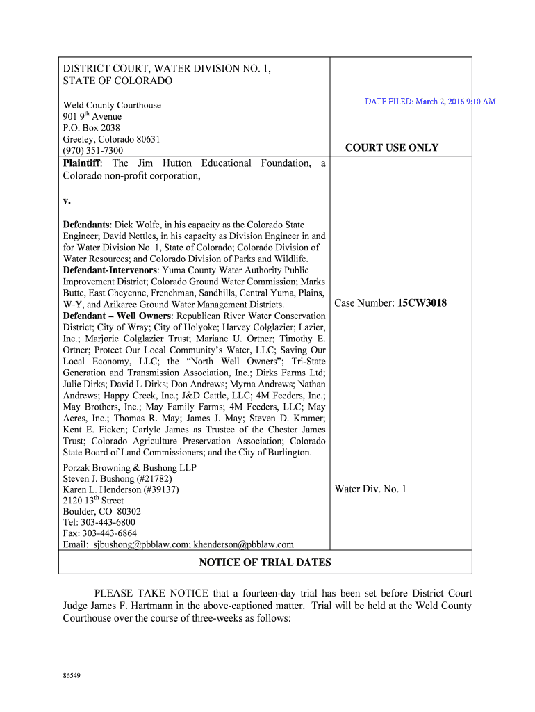 Get the free notice of trial dates - courts state co