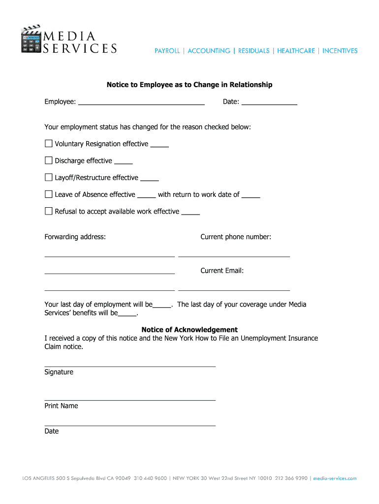 Notice to Employee as to Change in Relationship Employee: Date: Your employment status has changed for the reason checked below: Voluntary Resignation effective Discharge effective Layoff/Restructure