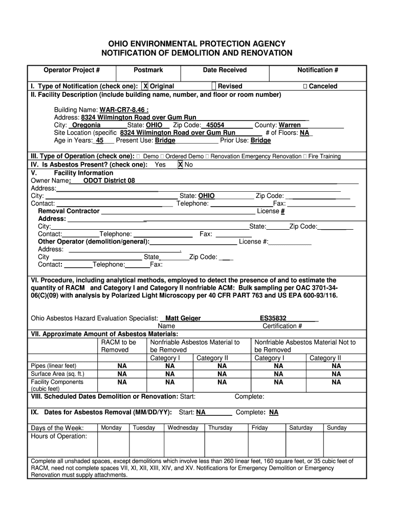 OHIO ENVIRONMENTAL PROTECTION AGENCY NOTIFICATION OF DEMOLITION AND RENOVATION Operator Project # Postmark Date Received Notification # I. Type of Notification (check one): X Original Revised II.