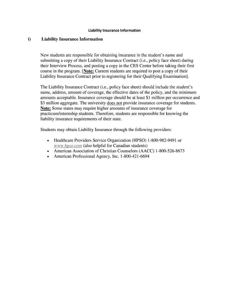 Liability Insurance Information)Liability Insurance Information New students are responsible for obtaining insurance in the students name and submitting a copy of their Liability Insurance Contract