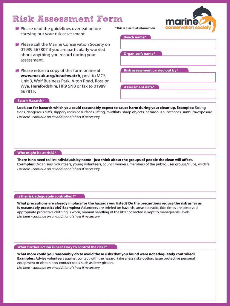 The Beachwatch Risk Assessment Form is a crucial tool designed to help organizers and volunteers identify and mitigate potential hazards encountered during beach clean-up activities. Properly completing this form assists in safeguarding participants and the environment by ensuring that risks are recognized and managed. Submitting this form to the Marine Conservation Society (MCS) is vital for compliance and effective coordination of clean-up efforts.
