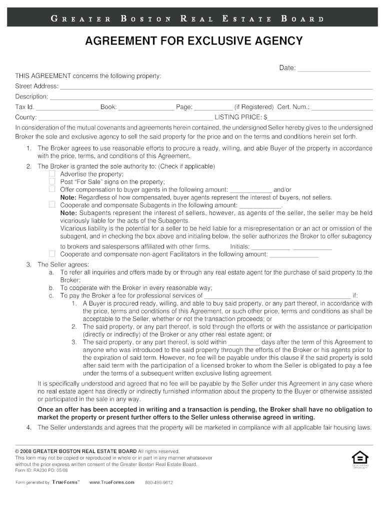 AGREEMENT FOR EXCLUSIVE AGENCY Date: THIS AGREEMENT concerns the following property: Street Address: Description: Tax Id. Book: Page: County: (if Registered) Cert. Num.: LISTING PRICE: $ In consideration