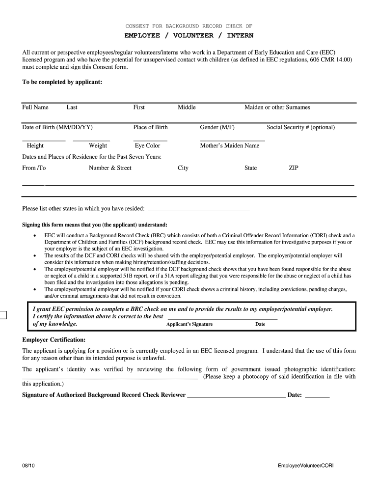 Generally, individuals applying for jobs, internships, or volunteer positions in EEC licensed programs in Massachusetts must use the Consent for Background Record Check form to authorize background checks.
