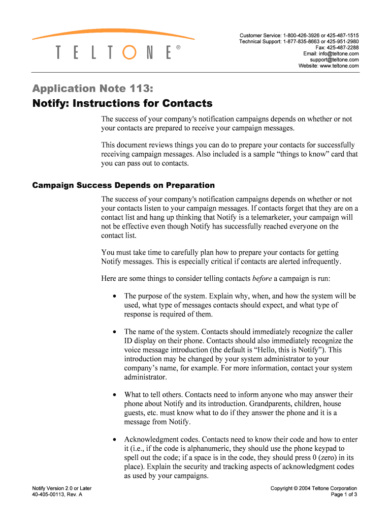 Customer Service: 18004263926 or 4254871515 Technical Support: 18778358663 or 4259512980 Fax: 4254872288 Email: info teltone.com support teltone.com Website: www.teltone.com Application Note 113: