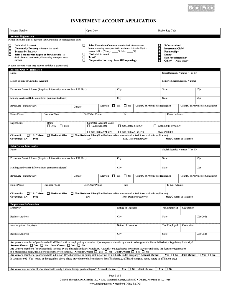 The Investment Account Application Form is a financial document used by individuals or entities to open an investment account with COR Clearing LLC.