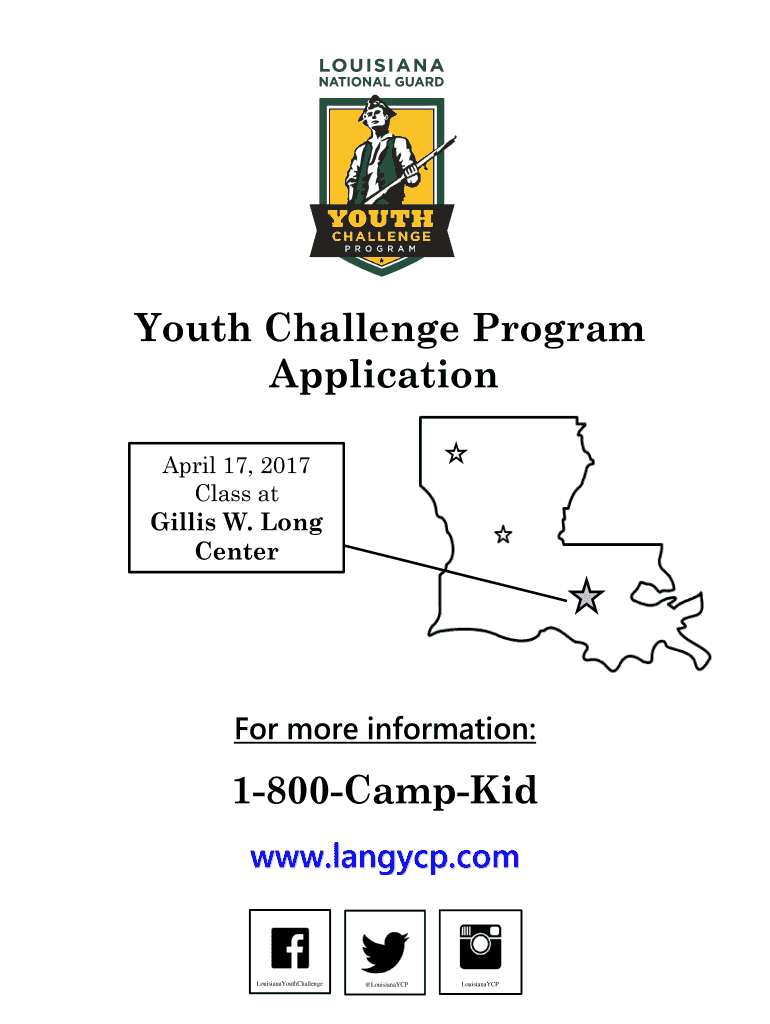 Youth Challenge Program Application April 17, 2017, Class at Gillis W. Long Center For more information: 1800CampKid www.langycp.com LouisianaYouthChallenge Louisiana Instructions to Apply: 1. Hand