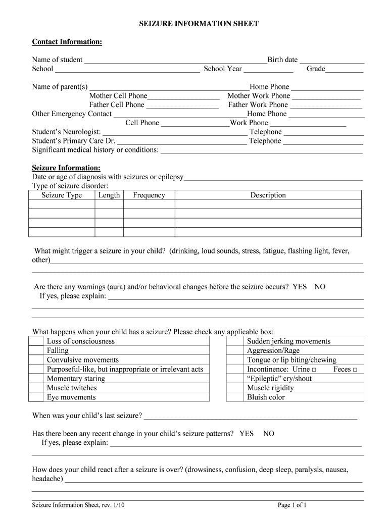 SEIZURE INFORMATION SHEET Contact Information: Name of student Birth date School Year Grade Name of parent(s) Home Phone Mother Cell Phone Mother Work Phone Father Cell Phone Father Work Phone Other
