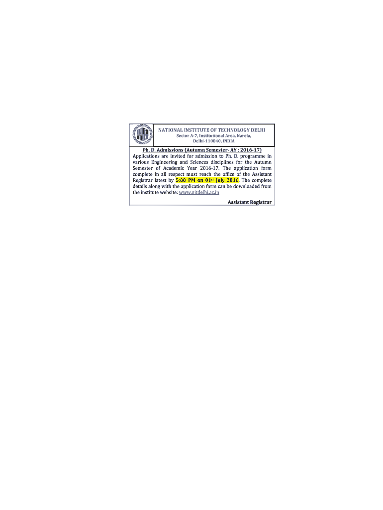 NATIONAL INSTITUTE OF TECHNOLOGY DELHI Sector A7, Institutional Area, Nearly, Delhi110040, INDIA Ph.D. Admissions (Autumn Semester A : 201617) Applications are invited for admission to Ph.D. program