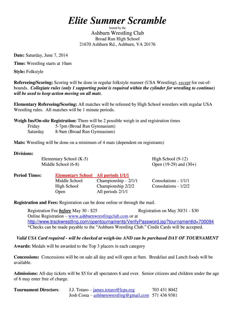 Elite Summer Scramble hosted by the Ashburn Wrestling Club Broad Run High School 21670 Ashburn Rd., Ashburn, VA 20176 Date: Saturday, June 7, 2014, Time: Wrestling starts at 10am Style: Folk style