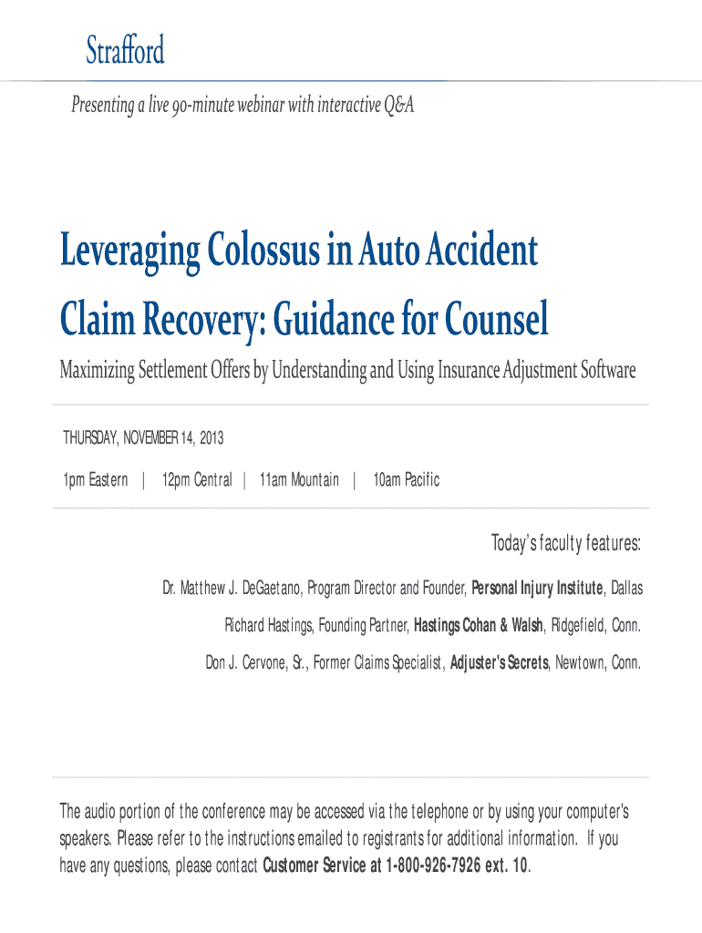 Presenting a live 90minute webinar with interactive Leveraging Colossus in Auto Accident Claim Recovery: Guidance for Counsel Maximizing Settlement Offers by Understanding and Using Insurance Adjustment