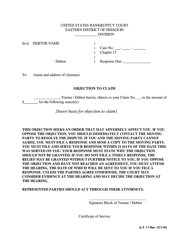 UNITED STATES BANKRUPTCY COURT EASTERN DISTRICT OF MISSOURI DIVISION In re DEBTOR NAME))))) Debtor. To: Case No. Chapter 13 Response Due: (name and address of claimant) OBJECTION TO CLAIM, Trustee