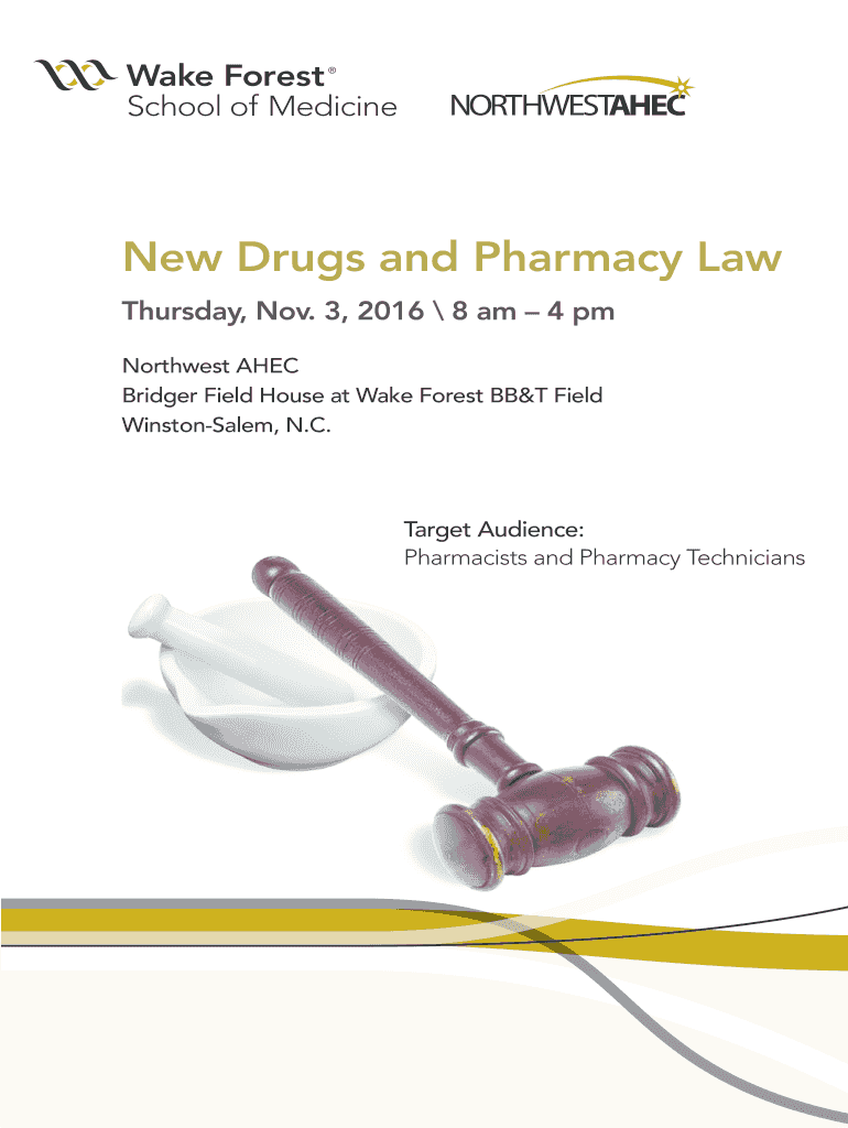 New Drugs and Pharmacy Law Thursday, Nov. 3, 2016 8 am 4 pm Northwest ALEC Bridger Field House at Wake Forest BBT Field Winston-Salem, N.C. Target Audience: Pharmacists and Pharmacy Technicians Cosponsored
