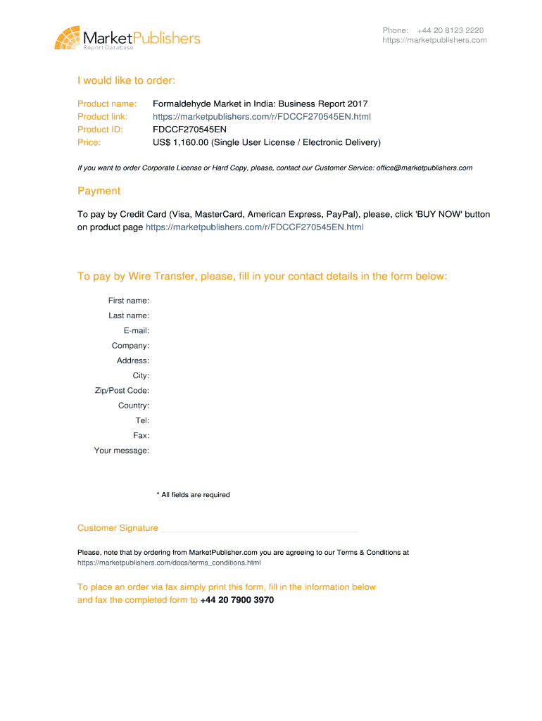 Formaldehyde Market in India: Business Report. 2017. Phone: +44 20 8123 2220 ... To pay by Wire Transfer, please, fill in your contact details in the form below:.