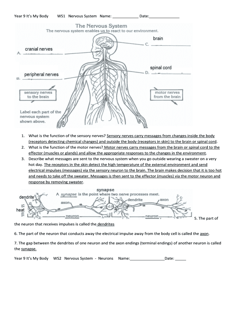 Year 9 It's My Body WS1 Nervous System Name: Date: 1. What is the function of the sensory nerves? Sensory nerves carry messages from changes inside the body (receptors detecting chemical changes)