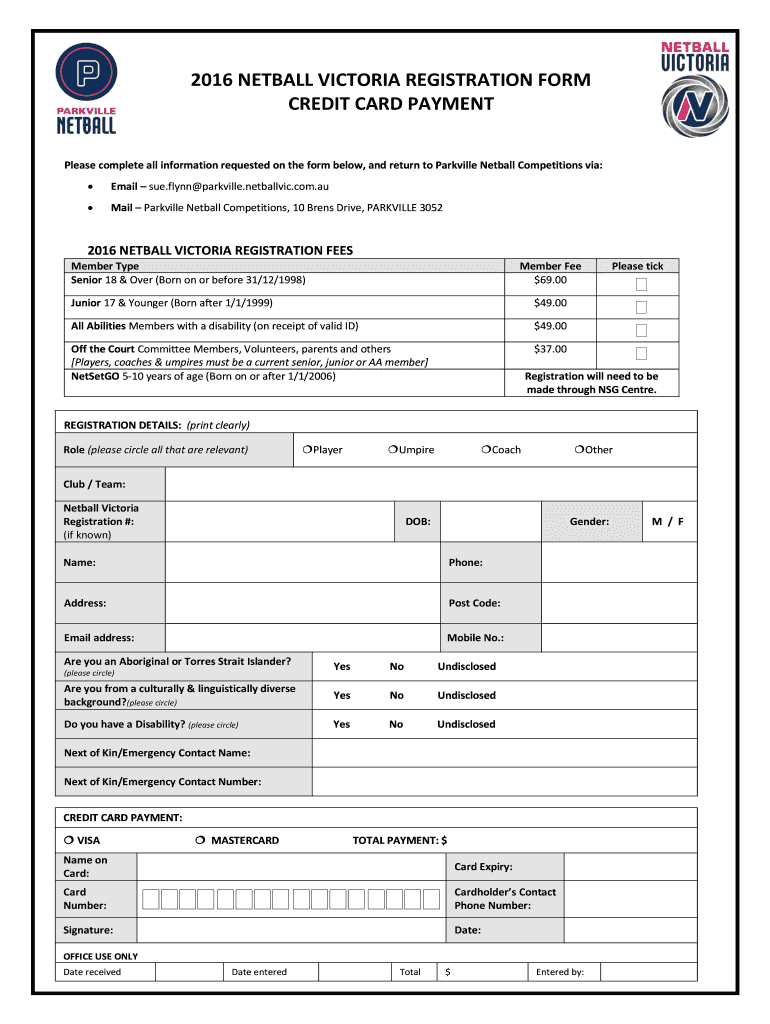 2016 NETBALL VICTORIA REGISTRATION FORM CREDIT CARD PAYMENT Please complete all information requested on the form below, and return to Parkville Netball Competitions via: Email sue. Flynn Parkville.netballvic.com.AU