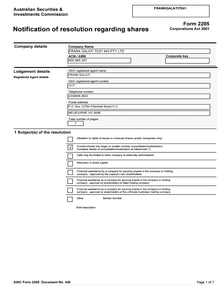 FRANKGALATITE41 Australian Securities & Investments Commission Notification of resolution regarding shares Company details Company Name FRANK GALATIA TEST 643 PTY LTD Corporate key ACN / ABN 600 065