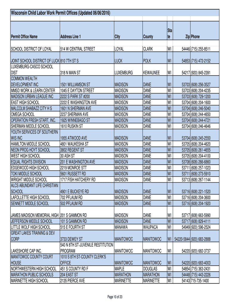 Get the free Wisconsin Child Labor Work Permit Offices (Updated 06/06/2016) - lafollette madison ...