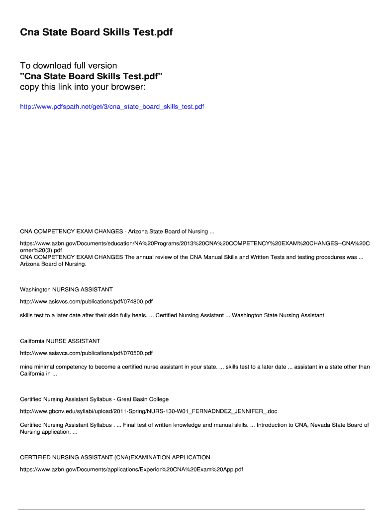 CNA State Board Skills Test.pdf To download full version “CNA State Board Skills Test.pdf copy this link into your browser: http://www.pdfspath.net/get/3/cna state board skills test.pdf CNA COMPETENCY