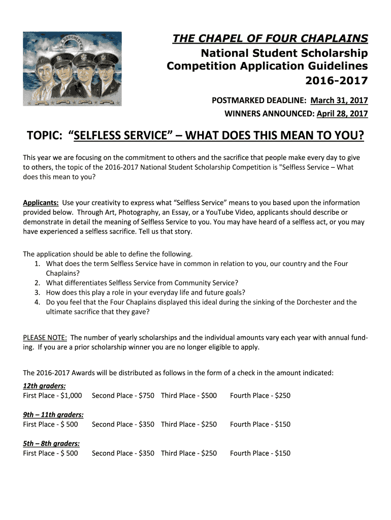 THE CHAPEL OF FOUR CHAPLAINS National Student Scholarship Competition Application Guidelines 20162017 POSTMARKED DEADLINE: March 31, 2017, WINNERS ANNOUNCED: April 28, 2017, TOPIC: SELFLESS SERVICE