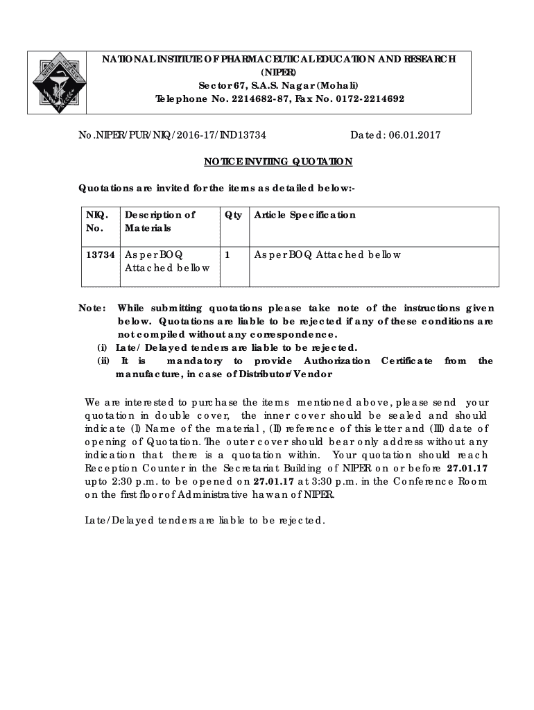 NATIONAL INSTITUTE OF PHARMACEUTICAL EDUCATION AND RESEARCH (SNIPER) Sector 67, S.A.S. Nagar (Moral) Telephone No. 221468287, Fax No. 01722214692 No.NIPER/PUR/NIQ/201617/IND13734 Dated: 06.01.2017