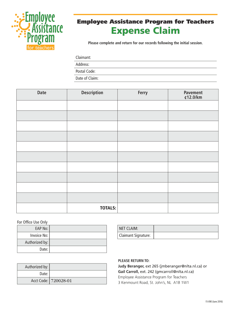 Employee Assistance Program for Teachers Expense Claim Please complete and return for our records following the initial session. Claimant: Address: Postal Code: Date of Claim: Date Description Ferry