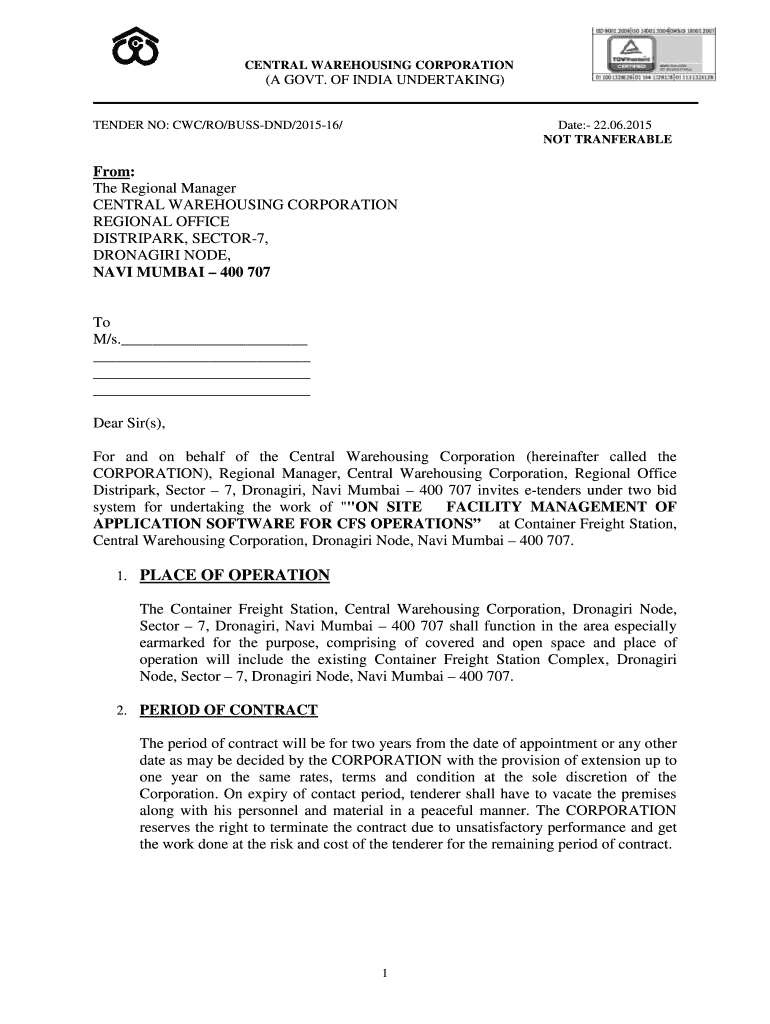 CENTRAL WAREHOUSING CORPORATION (A GOVT. OF INDIA UNDERTAKING) TENDER NO: CWC/RO/BUSS DND/201516/ Date: 22.06.2015 NOT TRANSFERABLE From: The Regional Manager CENTRAL WAREHOUSING CORPORATION REGIONAL