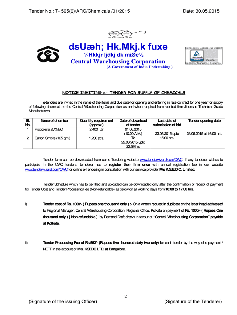 Tender No.: T 505(6)/ARC/Chemicals /01/2015 Date: 30.05.2015 duh; HK. Mk.k fuse Hiker JDK DK MIE Central Warehousing Corporation (A Government of India Undertaking) NOTICE INVITING e TENDER FOR SUPPLY