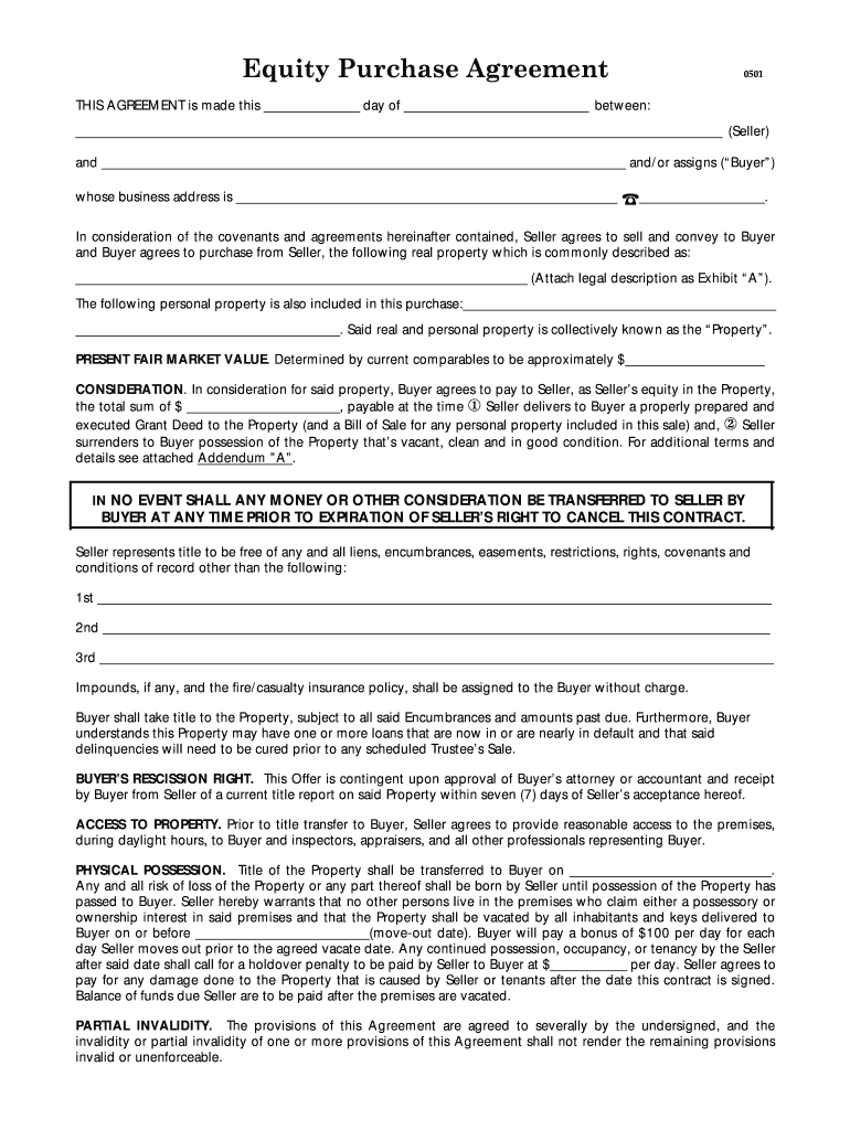 The primary purpose of the Equity Purchase Agreement is to protect both buyers and sellers in a real estate transaction. This document serves multiple benefits, including a clear understanding of the terms and conditions agreed upon by both parties. By using this agreement, sellers and buyers can effectively outline their obligations, reducing the risk of misunderstandings.