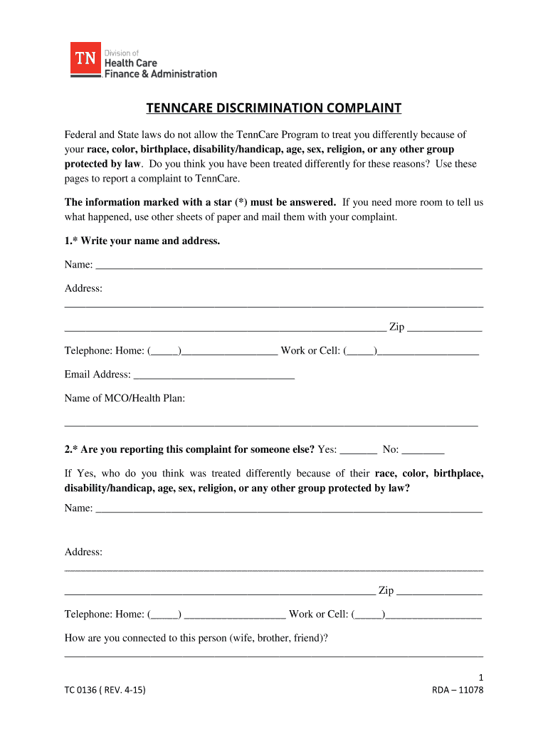 Get the free TENNCARE DISCRIMINATION COMPLAINT - tn