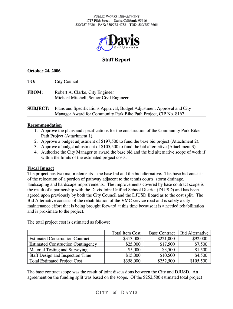 PUBLIC WORKS DEPARTMENT 1717 Fifth Street Davis, California 95616 530/7575686 FAX: 530/7584738 TDD: 530/7575666 Staff Report October 24, 2006, TO: City Council FROM: Robert A. Clarke, City Engineer