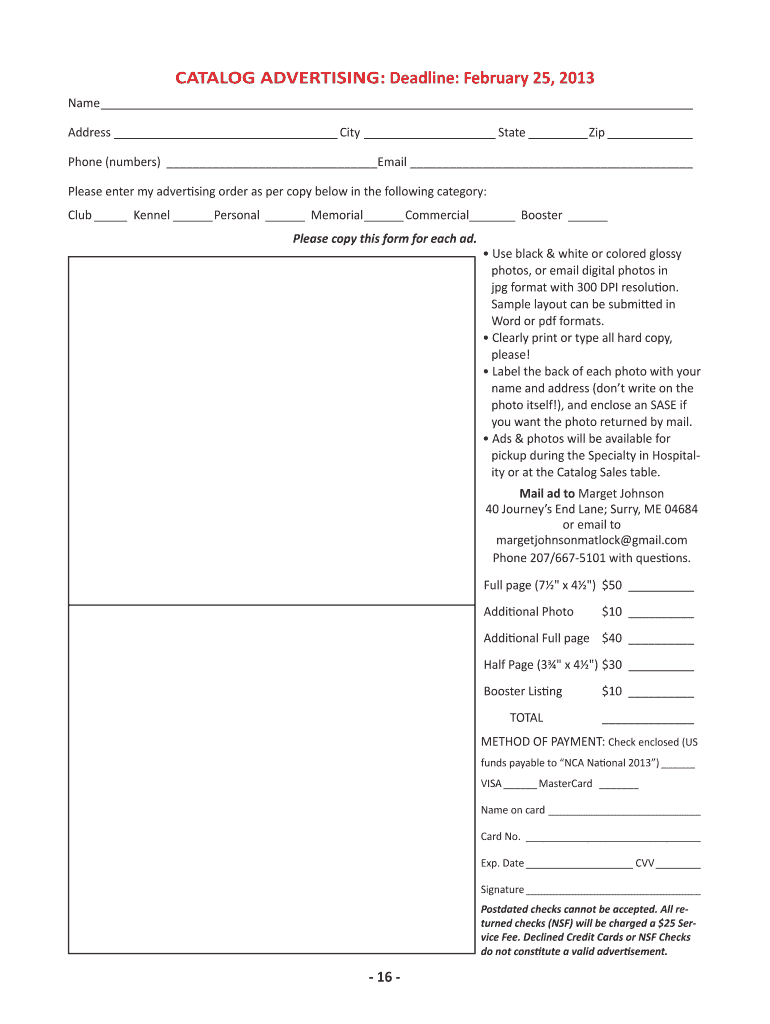 CATALOG ADVERTISING: Deadline: February 25, 2013, Name Address City State Zip Phone (numbers) Email Please enter my advertising order as per copy below in the following category: Club Kennel Personal