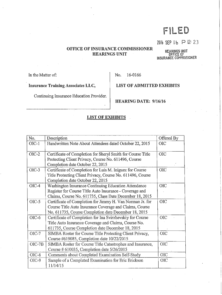 FILED 10lb SEP I b P 12: 23 OFFICE OF INSURANCE COMMISSIONER HEARINGS UNIT No. In the Matter of: Insurance Training Associates LLC, HEAR111GS HIT OFFICE OF INSURANCE COMMISSIONER 160166 LIST OF ADMITTED