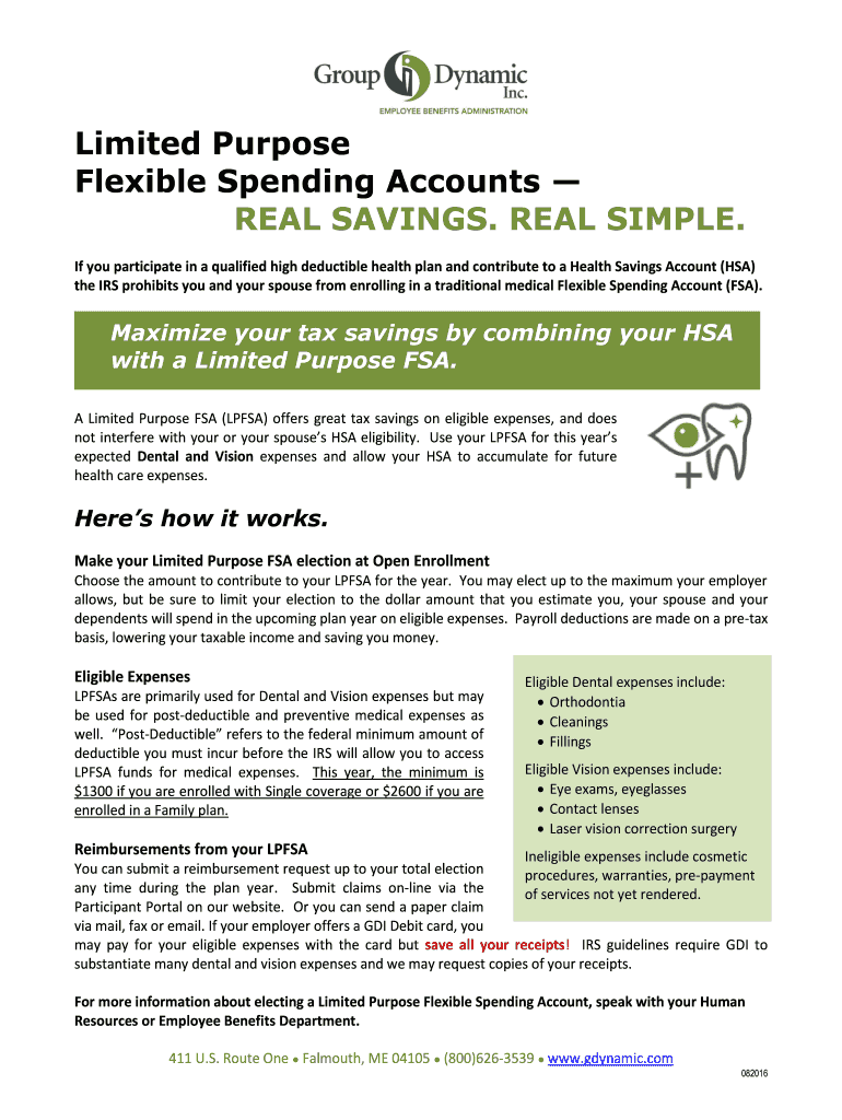 Limited Purpose Flexible Spending Accounts REAL SAVINGS. REAL SIMPLE. If you participate in a qualified high deductible health plan and contribute to a Health Savings Account (HSA) the IRS prohibits