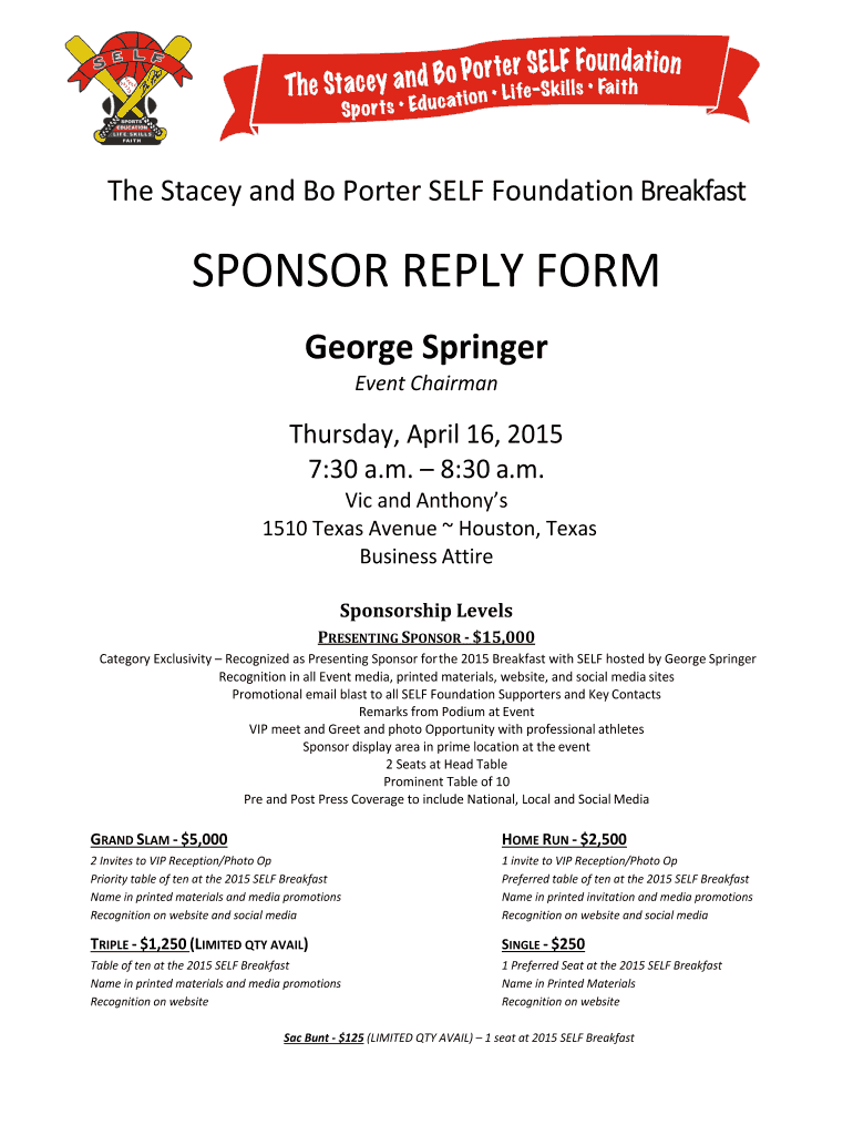 The Stacey and BO Porter SELF Foundation Breakfast SPONSOR REPLY FORM George Springer Event Chairman Thursday, April 16, 2015 7:30 a.m. 8:30 a.m. Vic and Anthony's 1510 Texas Avenue Houston, Texas