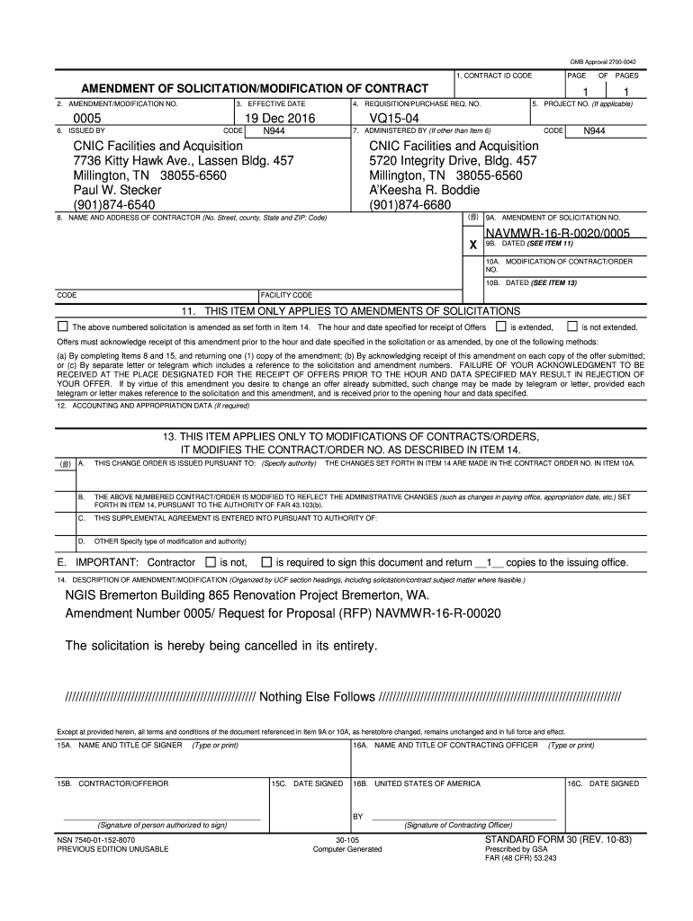 OMB Approval 27000042 1. CONTRACT ID CODE PAGE AMENDMENT OF SOLICITATION/MODIFICATION OF CONTRACT 2. AMENDMENT/MODIFICATION NO. 3. EFFECTIVE DATE 0005 CODE PAGES 1 4. REQUISITION/PURCHASE REQ. NO.