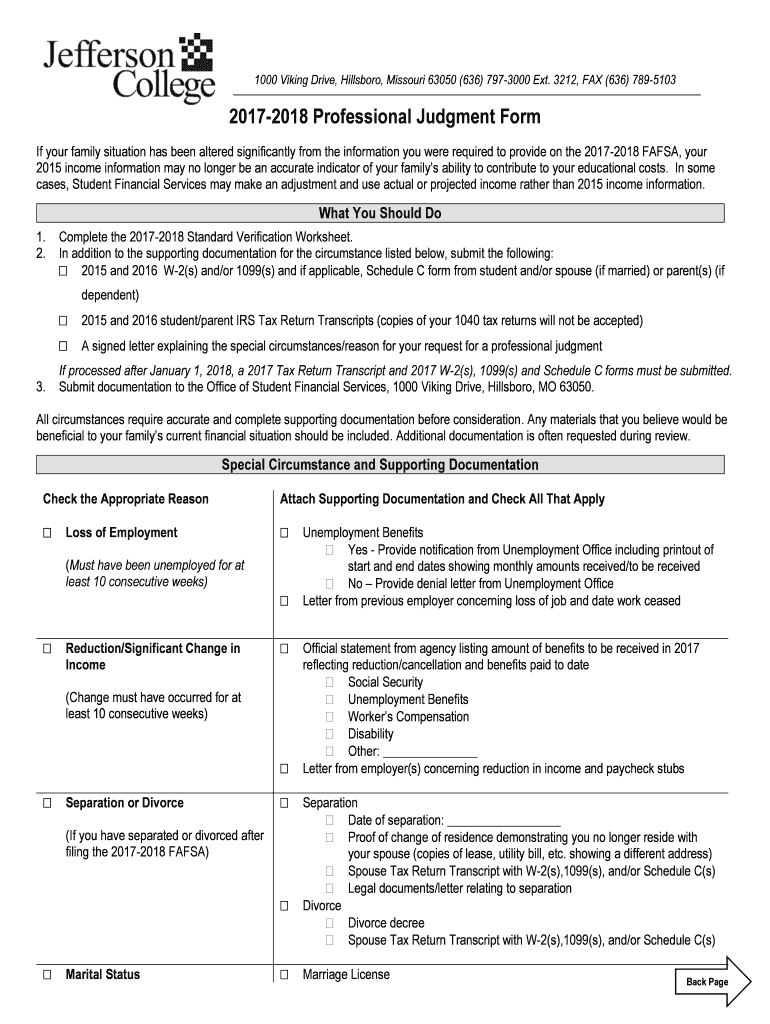1000 Viking Drive, Hillsboro, Missouri 63050 (636) 7973000 Ext. 3212, FAX (636) 7895103 20172018 Professional Judgment Form If your family situation has been altered significantly from the information
