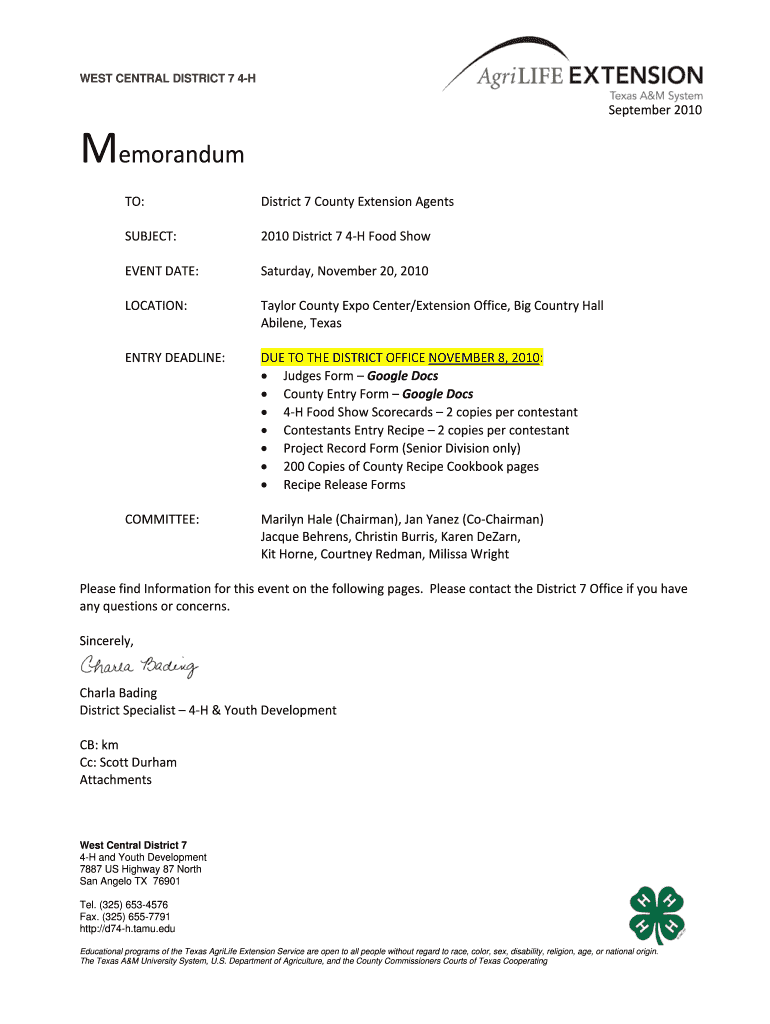 WEST CENTRAL DISTRICT 7 4HSeptember2010Memorandum TO: SUBJECT:District7CountyExtensionAgents2010District74HFoodShowEVENTDATE: LOCATION: ENTRYDEADLINE:Saturday,November20,2010 TaylorCountyExpoCenter/ExtensionOffice,