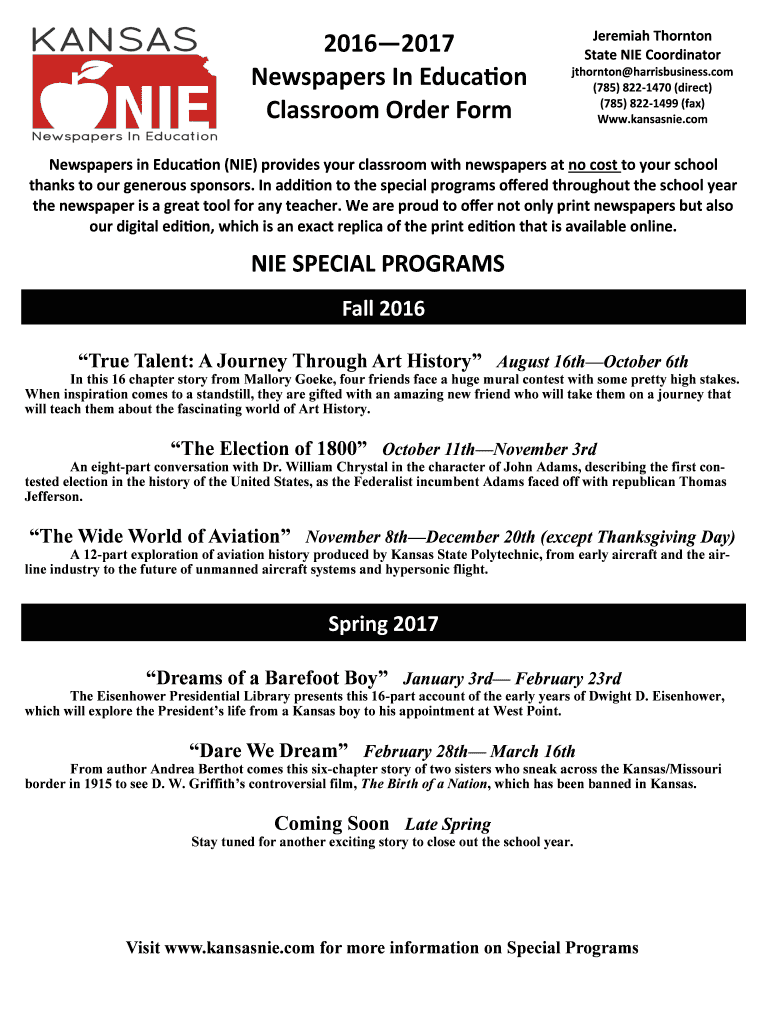 20162017 Newspapers In Education Classroom Order Form Jeremiah Thornton State NICE Coordinator Thornton harrisbusiness.com (785) 8221470 (direct) (785) 8221499 (fax) WWW.kansasnie.com Newspapers in